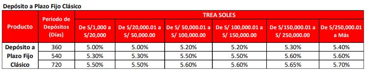 Ejemplo referencial:Depósito a Plazo Fijo Clásico: Por un saldo de apertura de S/ 1,000.00 a 360 días, a una TEA de 5.00% y sin considerar movimientos en la cuenta, el cliente recibe S/ 50.00 de intereses al final del período.Saldo mínimo de equilibrio: cualquier monto que se mantenga en la cuenta.Operaciones afectas al ITF (0.005%). Para mayor información sobre condiciones, restricciones, tasas de interés, comisiones y gastos, consultar en el tarifario vigente publicado en www.cajamaynas.pe o en nuestras agencias a nivel nacional.Información brindada de conformidad con el Reglamento de Gestión de Conducta de Mercado del Sistema Financiero aprobado mediante Resolución SBS N° 3274-2017 y sus modificatorias. CAJA MAYNAS S.A. – RUC: 20103845328