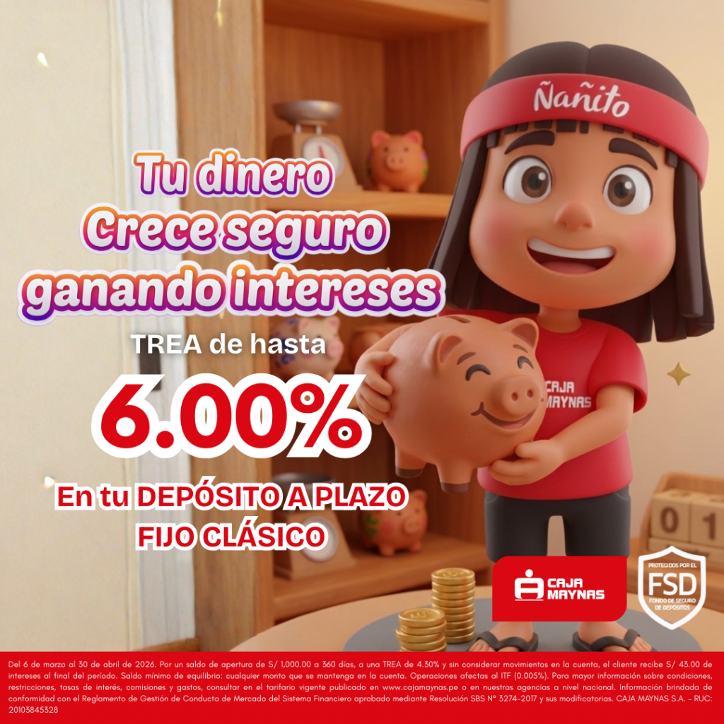 Información brindada de conformidad con el Reglamento de Gestión de Conducta de Mercado del Sistema Financiero aprobado mediante Resolución SBS N° 3274-2017 y sus modificatorias. CAJA MAYNAS S.A. – RUC: 20103845328.