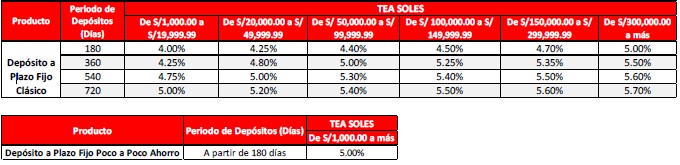 1. No aplica en moneda extranjera.2. No aplica para personas jurídicas3. No aplica para renovaciones automáticas4. En casos de cancelaciones anticipadas, los intereses para los depósitos a Plazo Fijo Clásico y Poco a Poco Ahorro serán abonados de acuerdo a la TEA fijada para cuentas de ahorro corriente.