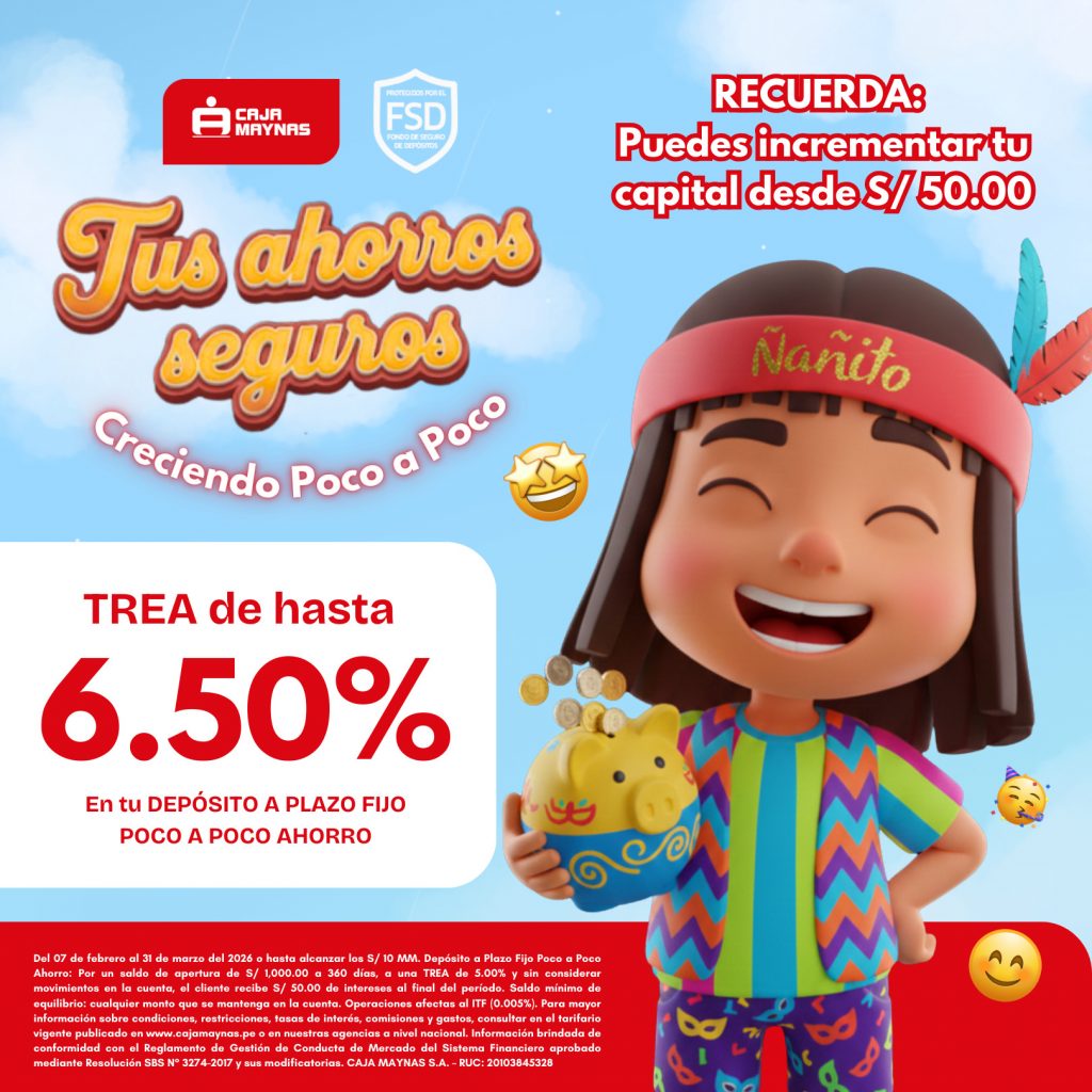 Información brindada de conformidad con el Reglamento de Gestión de Conducta de Mercado del Sistema Financiero aprobado mediante Resolución SBS N° 3274-2017 y sus modificatorias. CAJA MAYNAS S.A. – RUC: 20103845328