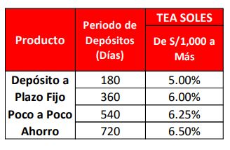 Depósito a Plazo Fijo Poco a Poco Ahorro: Por un saldo de apertura de S/ 1,000.00 a 360 días, a una TREA de 5.00% y sin considerar movimientos en la cuenta, el cliente recibe S/ 50.00 de intereses al final del período.